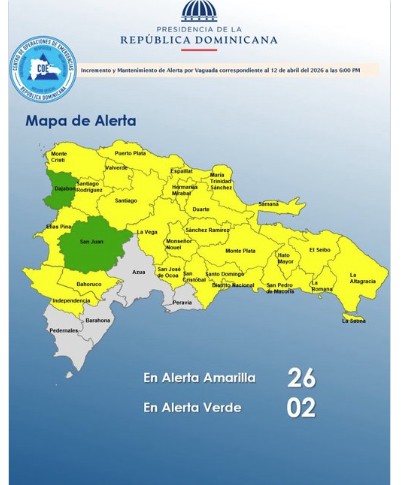 El Centro de Operaciones de Emergencias (COE) informó que mantiene 25 provincias y el Distrito Nacional en alerta amarilla, mientras que dos permanecen en verde, ante la persistencia de condiciones meteorológicas e hidrológicas favorables para que continúen las lluvias en gran parte del país, según el INDOMET y el INDRHI.
