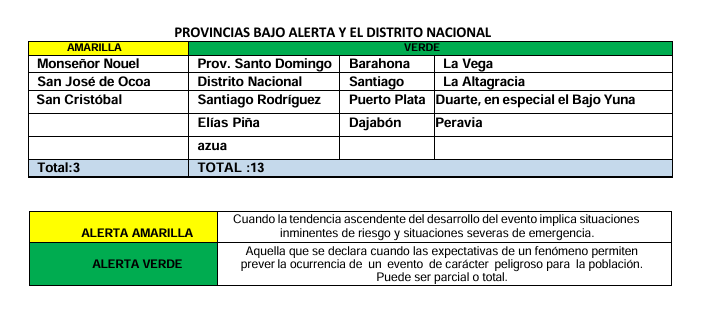 La Dirección del Centro de Operaciones de Emergencias (COE) informó que amplió y mantiene los niveles de alerta en varias provincias y el Distrito Nacional, ante las lluvias que continúan registrándose en gran parte del país.