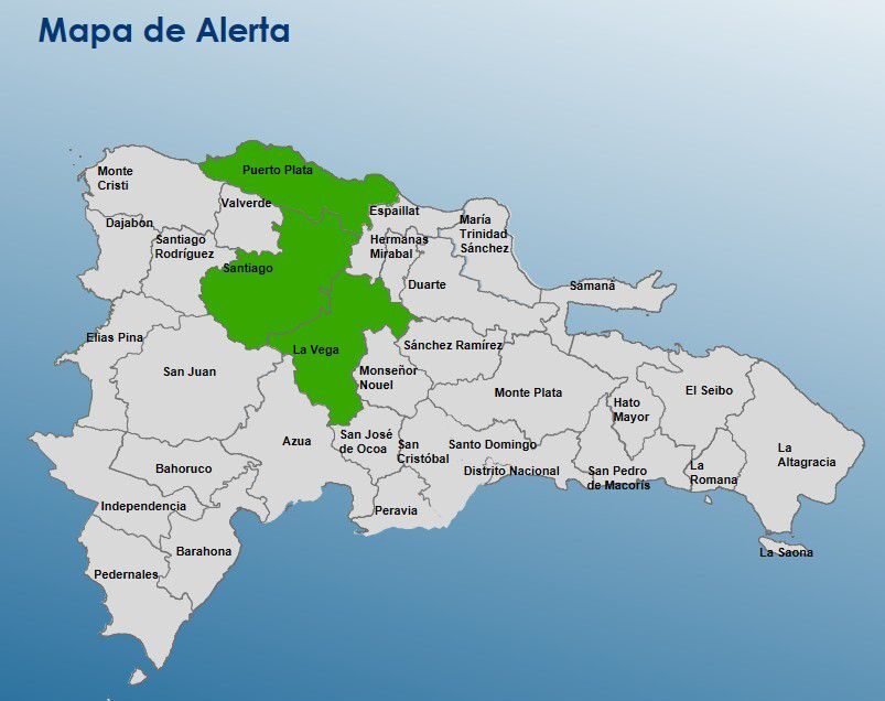 El Centro de Operaciones de Emergencias (COE) colocó este viernes 03 provincias en alerta verde debido a la incidencia sobre el país de una vaguada prefrontal que ha provocado lluvias moderadas a fuertes en distintas zonas del territorio nacional.