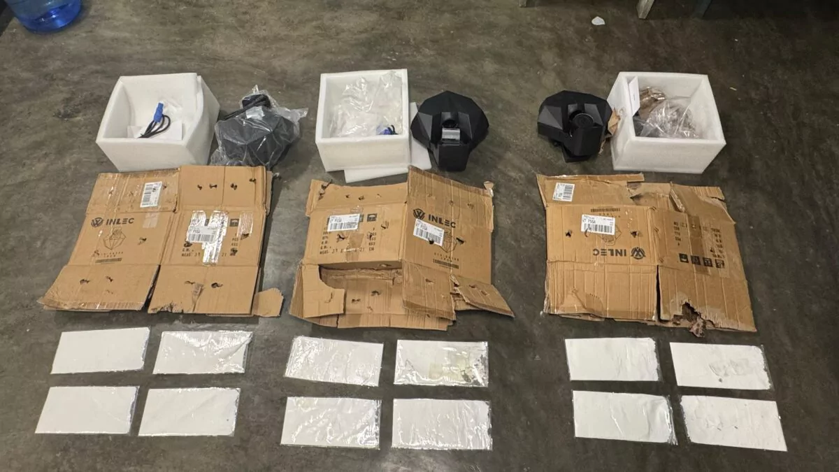 Tras una revisión más detallada, los agentes descubrieron que seis de las cajas tenían un doble fondo en sus tapas, en el cual se ocultaban las 12 láminas de presunta cocaína, empaquetadas en fundas plásticas transparentes, con un peso total superior a 900 gramos.