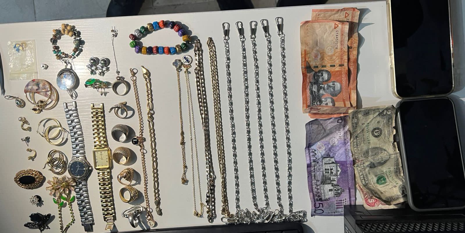 Al momento de la requisa, los uniformados le ocuparon relojes, cadenas, anillos, aretes, pulseras, medallas, dos celulares iPhone, dinero en efectivo y otros artículos, que llevaba ocultos en los bolsillos.