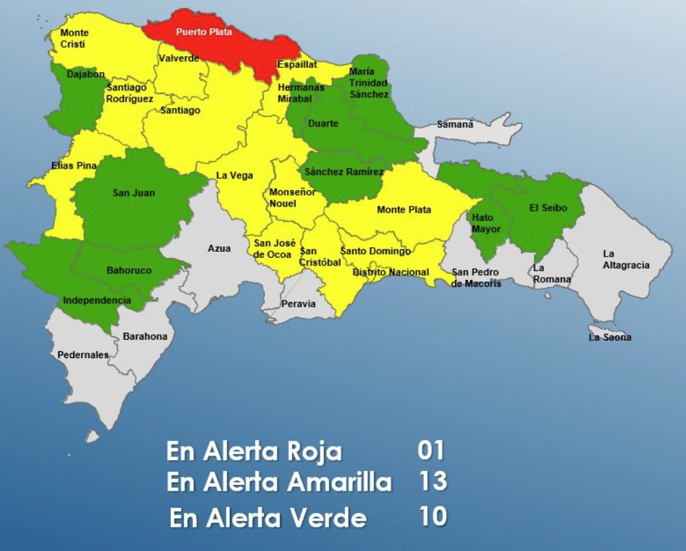 De acuerdo con el reporte, Puerto Plata se mantiene en alerta roja . En tanto, 13 provincias están en alerta amarilla y otras 10 figuran en verde , debido a posibles lluvias , tormentas eléctricas , ráfagas de viento y probables granizadas .