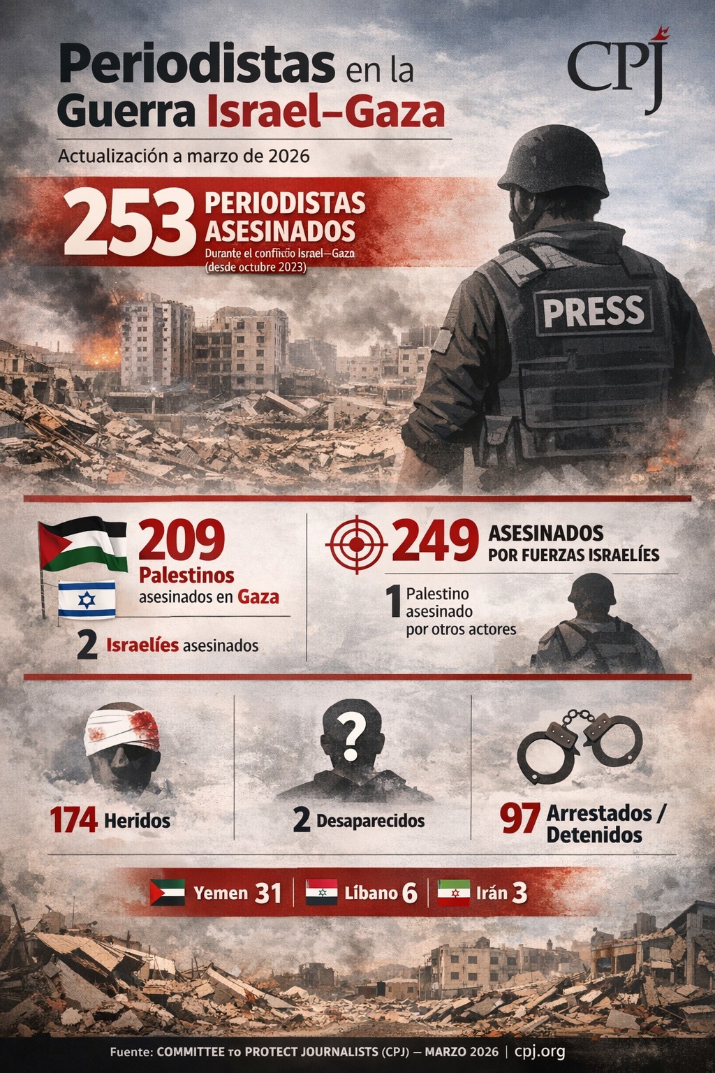 Desde octubre de 2023, 253 periodistas han sido asesinados en el conflicto Israel–Gaza. De ellos, 209 eran palestinos en Gaza. 249 muertes han sido atribuidas a acciones militares israelíes. A esto se suman 174 heridos, 97 detenidos y 2 desaparecidos.